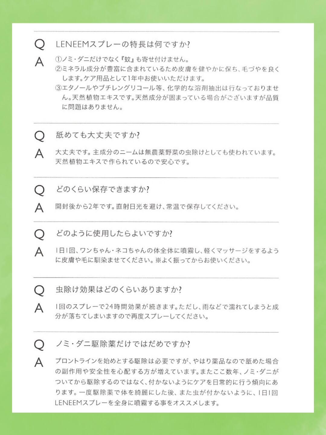 LENEEM虫除けスプレーは、天然成分を使用しているため、犬猫、人間に優しくご使用いただけます。